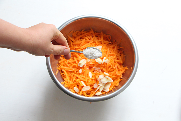 - Dans un saladier mélanger les carottes, l’ail et le sel en les pressant à pleines mains pour bien mélanger et répartir le sel